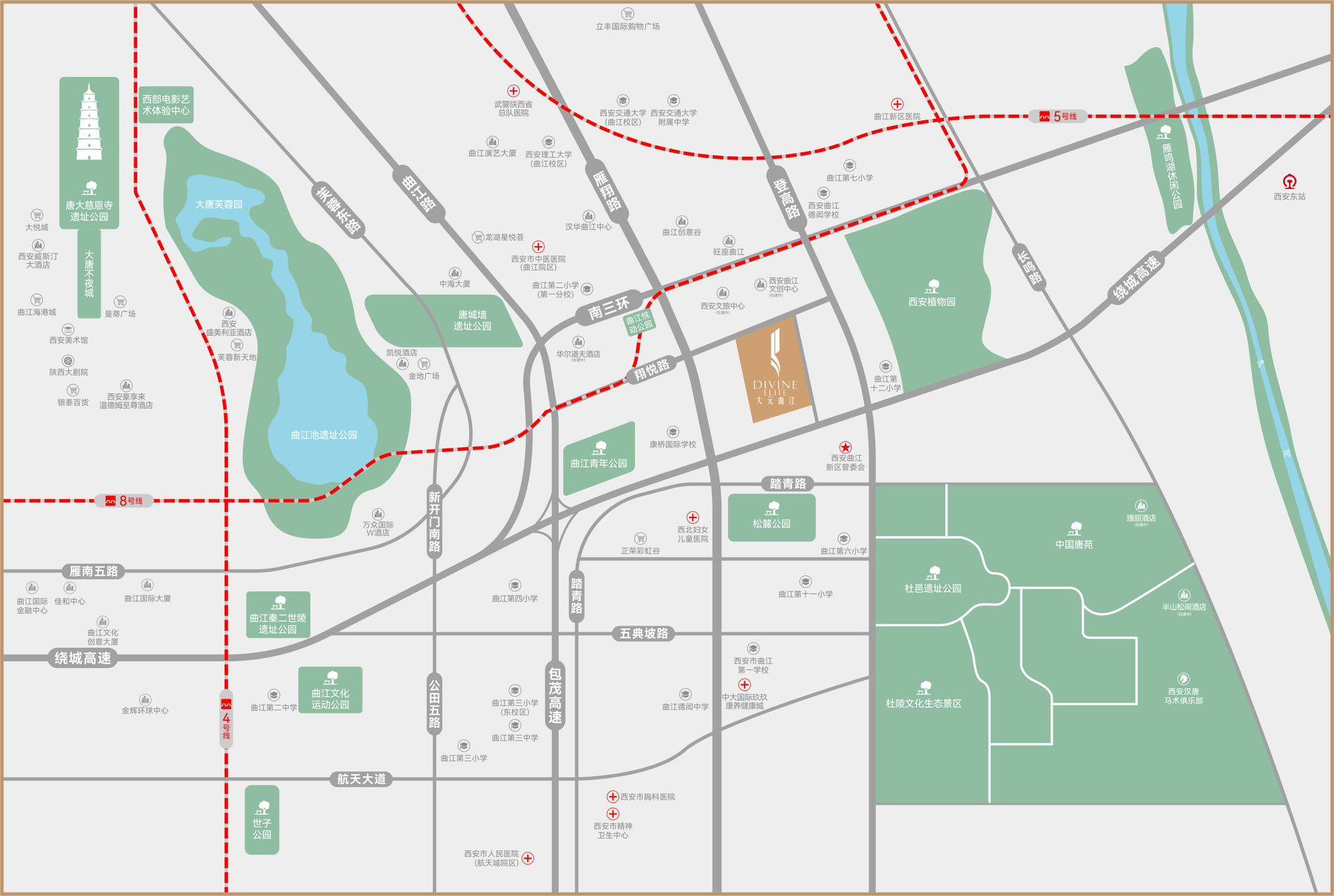 板块拥有西安最优质的国际教育资源,商业氛围成熟、从城市主干道路到高速交通管网,出行便捷,规划在建的地铁8号线、西安东站、多座地标级超高层写字楼、曲江新区医院等,都印证着该板块的发展飞速,升值潜力不可限量。