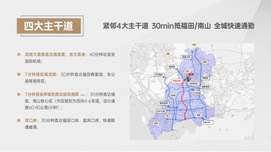 7分钟直连侨城东路北延快速路(在建):30分钟直达福田、南山核心区(市区规划为双向4-6车道,设计速度60-80公里/小时);