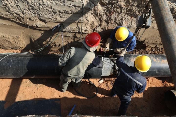 工人们在兰州市皋兰县一处供热改造项目现场更换供热管道。(兰州市委宣传部供图)